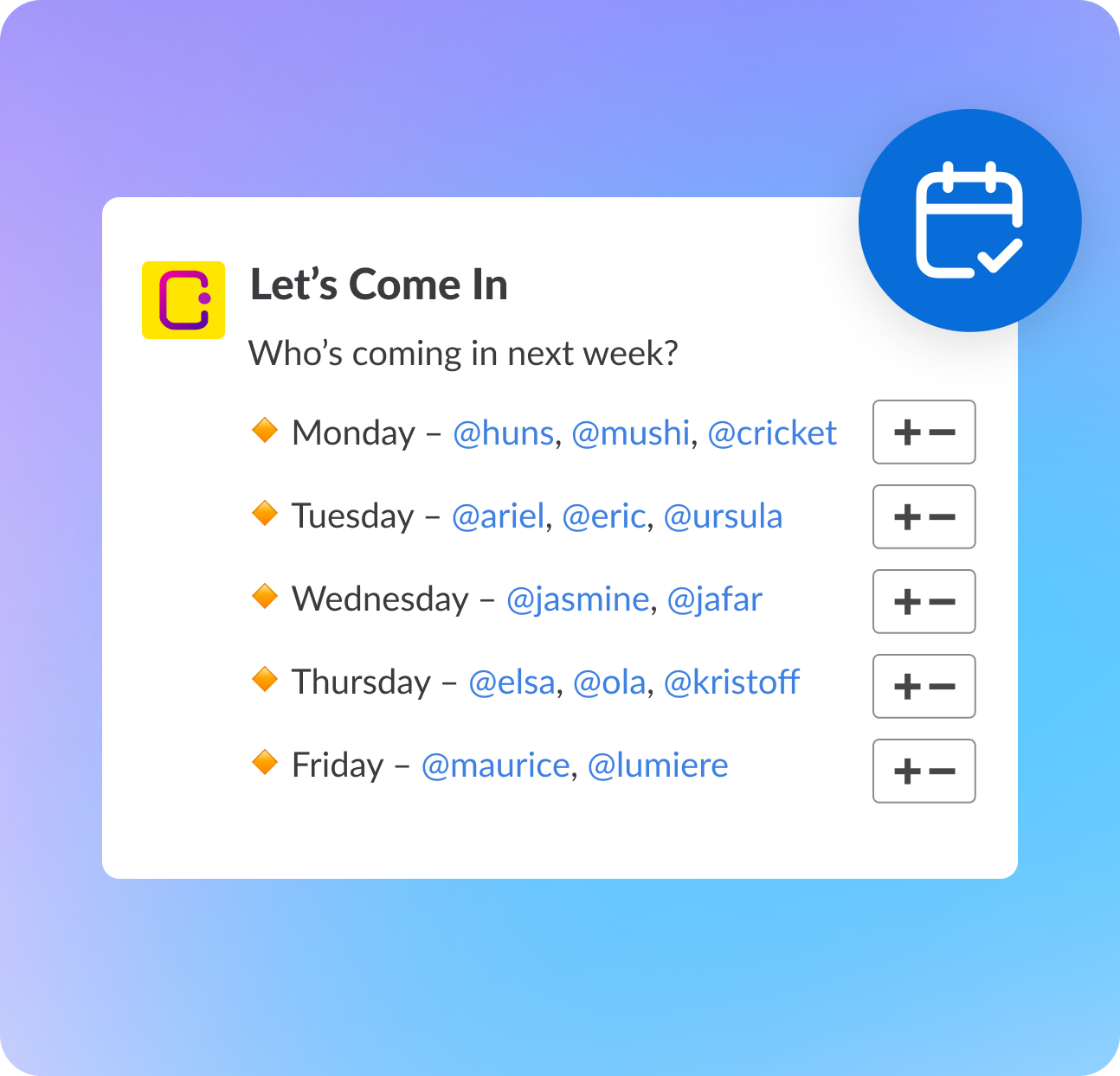 Get a daily (or weekly) summary of who's coming in your #office channel. So there's zero friction for people to pick their days.
